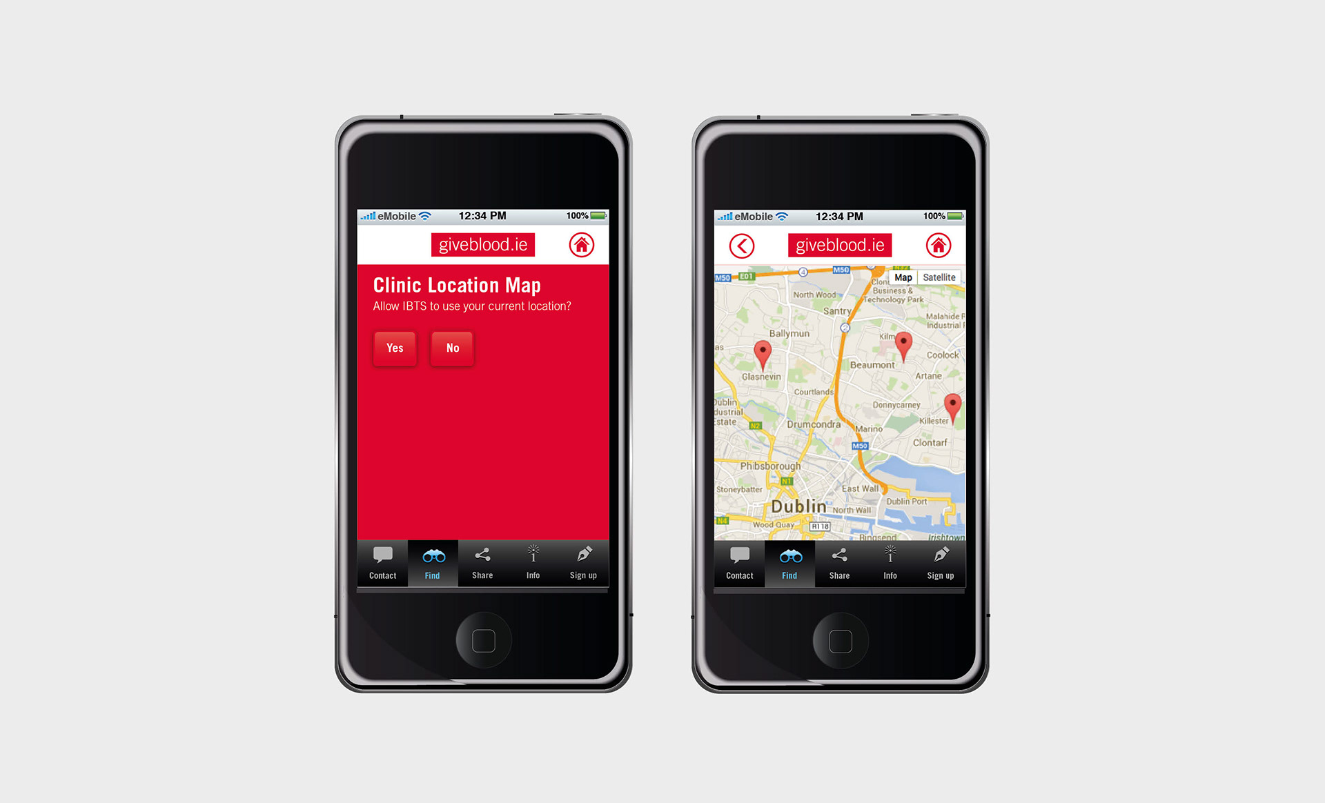 IBTS commissioned Chemistry & Clickworks to create their new app which was to help donors find out how to donate blood more easily. A key requirement was that red was to be (almost) the only colour to be used for the app. Glass-like buttons were created to fulfill this requirement and resulted in quite a striking app.