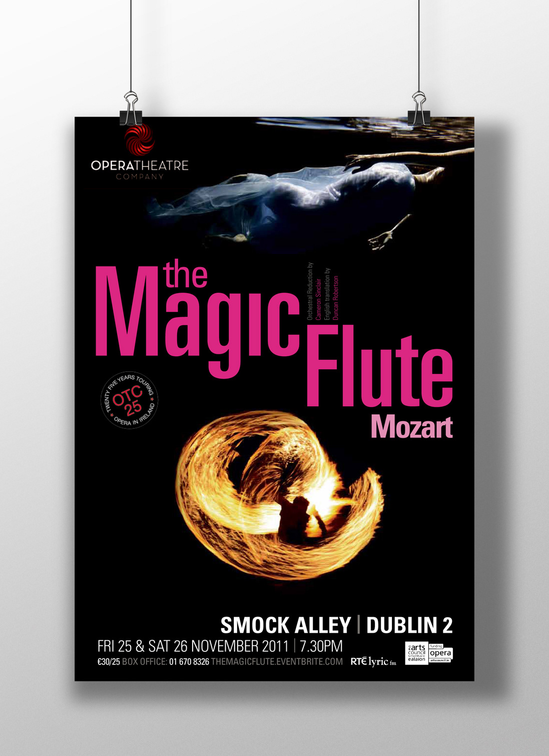 Opera Theatre Company approached Clickworks to create posters and leaflets to advertise their new play 'The Magic Flute'. The inspiration for the design came from two parts of the play – a trial by fire and water.